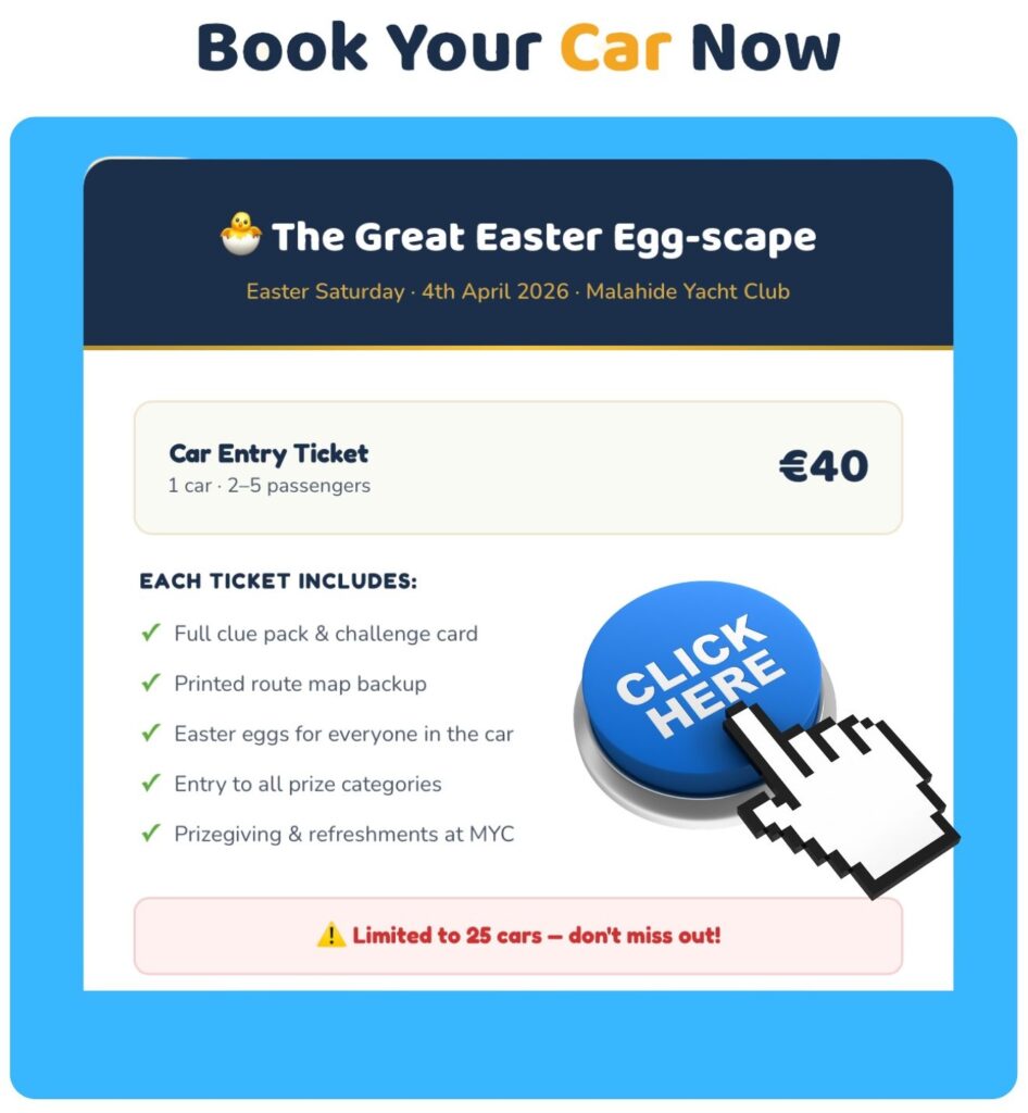 Pile your crew into the car and hit the road for a cracking Easter adventure through the stunning villages and coastline of North County Dublin! Solve riddles, discover hidden locations, complete hilarious photo challenges, and race back to the Yacht Club for prizes, laughs, and refreshments.