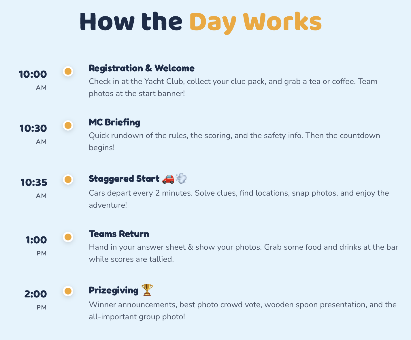 No special tech required. No running. Just a car, a sense of humour, and a competitive streak. Perfect for families, couples, and groups of friends.