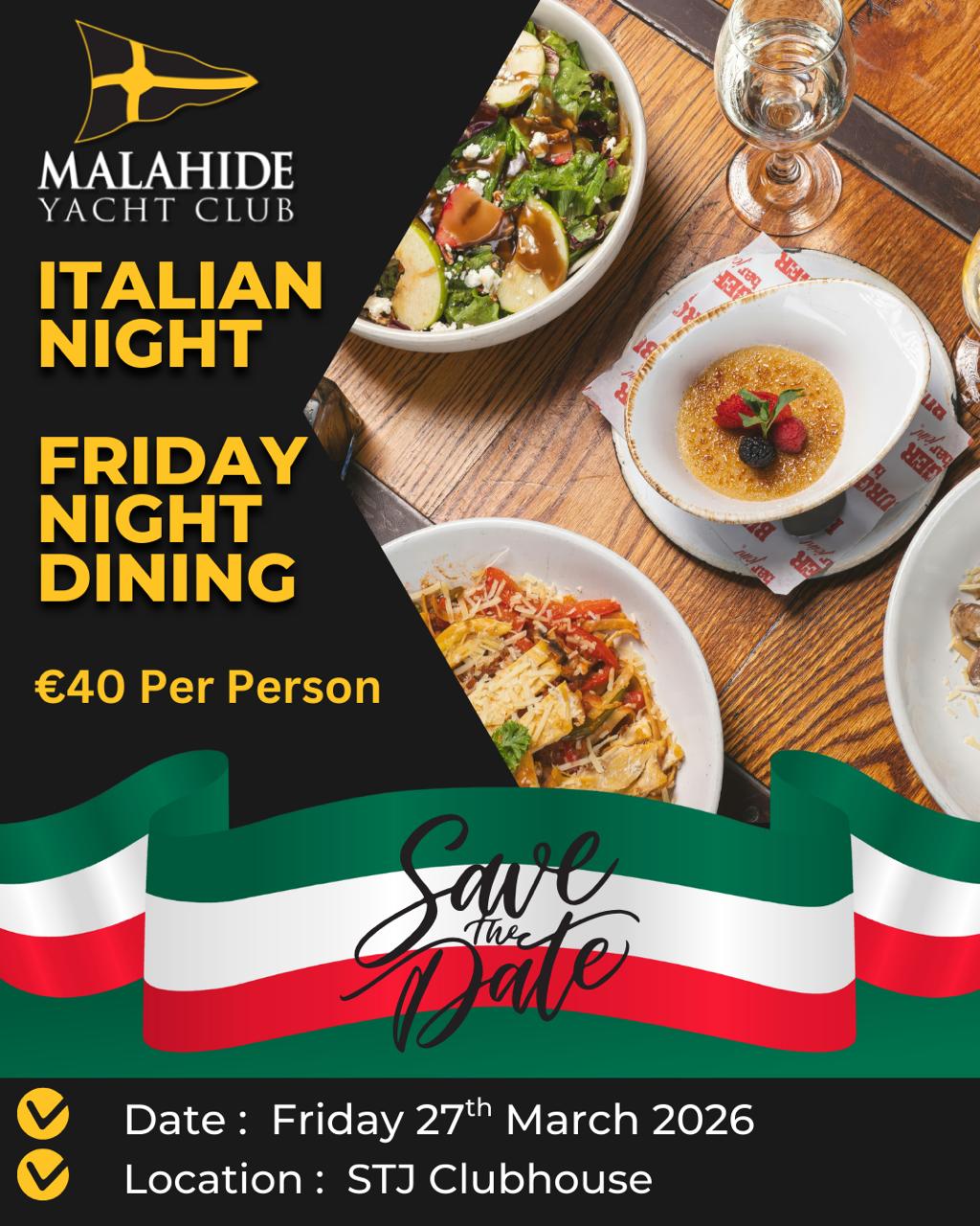 We are delighted to announce the return of Friday Night Dining at Malahide Yacht Club, kicking off with a special Italian Night on Friday 27th March 2026 in the STJ Clubhouse.