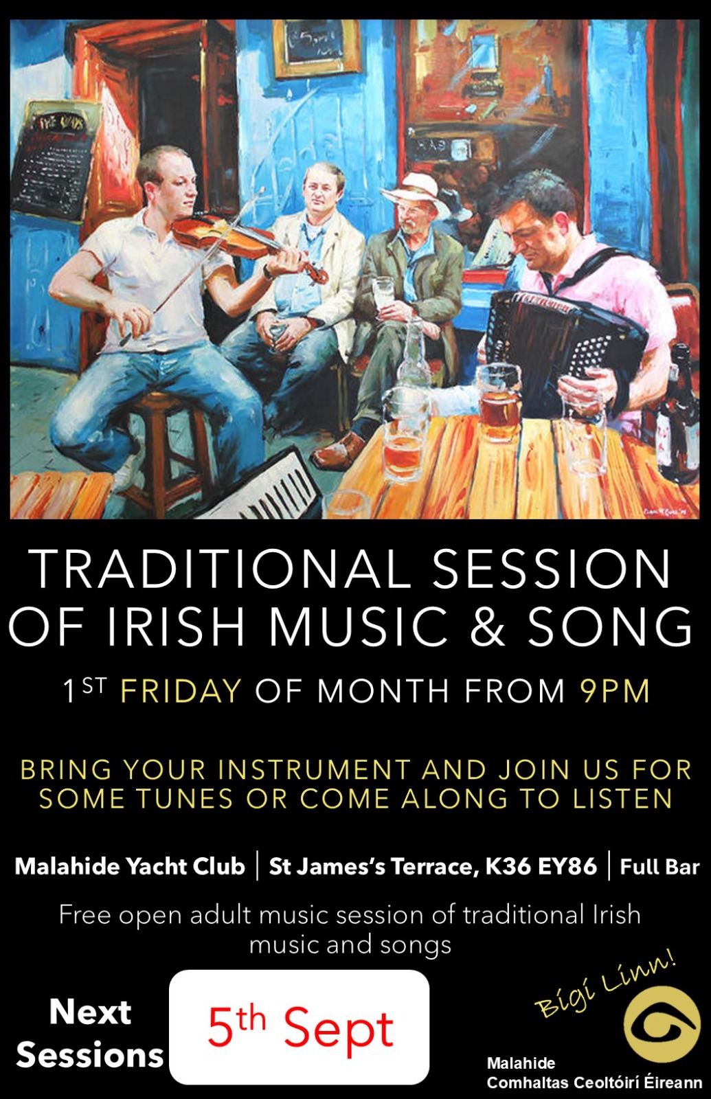 Our monthly night of Traditional Music and Song is back ! We are delighted to confirm that on the 1st Friday of each Month MYC will be hosting our friends from Malahide Comhaltas Ceoltóiri Éireann in our St. James Terrace Clubhouse from 9.00pm onwards for a Free open adult music session of traditional Irish music